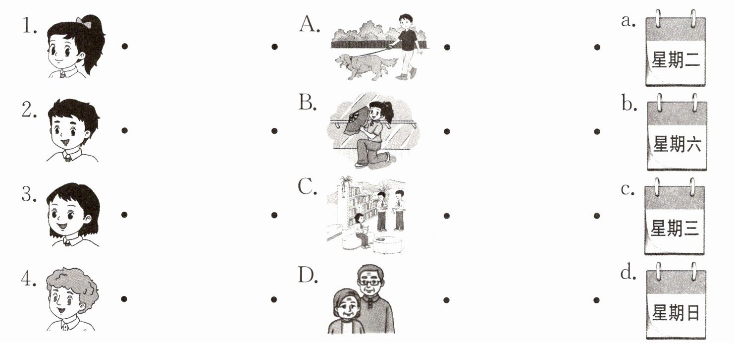 一、听录音,将人物、活动和时间连线。(听两遍)