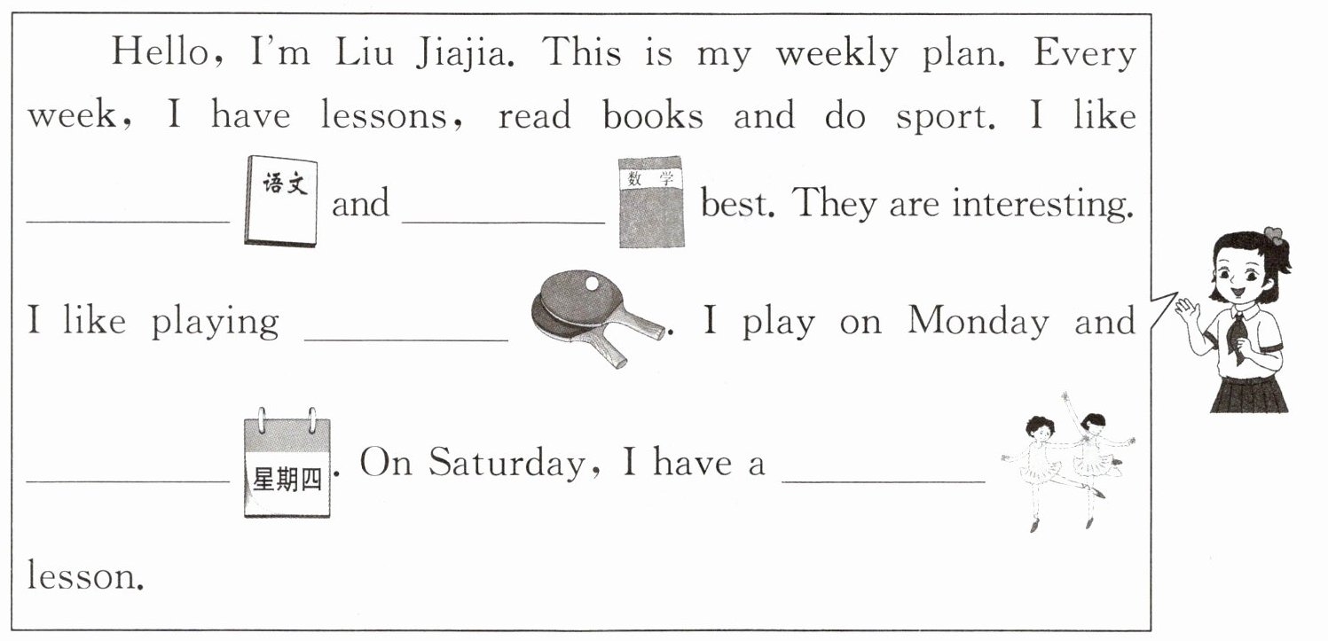 九、根据图片提示,帮助刘佳佳完成她的每周计划,每空一词。