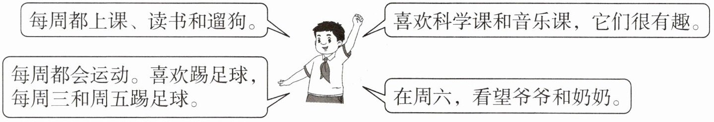 Hello, I'm Zhang Hua. This is my weekly plan. Every week, I have lessons, read books and walk the dog. I like science and music. They are interesting. I do sport every week. I like playing football. I play on Wednesday and Friday. On Saturday, I go to visit my grandparents.