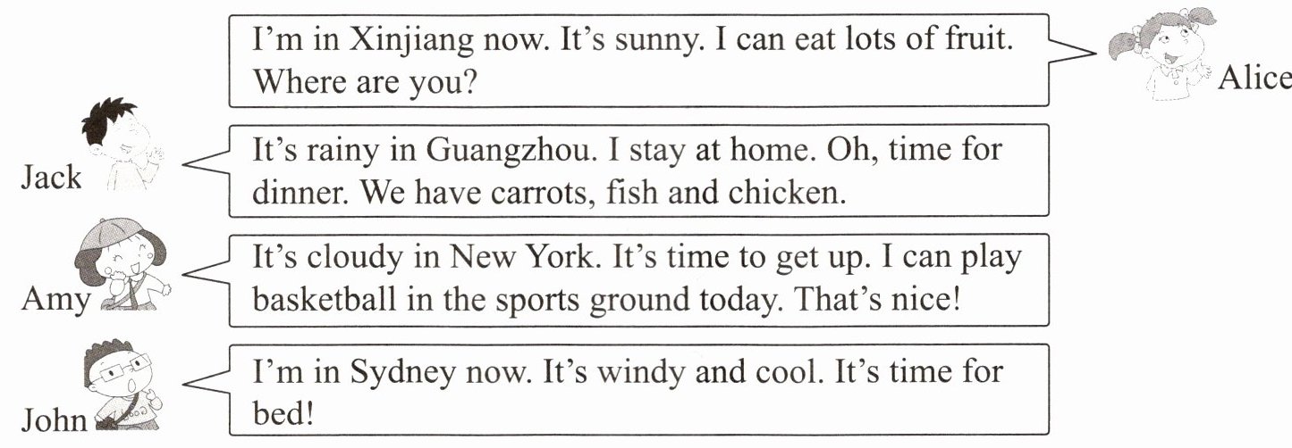 Amy It's cloudy in New York. It's time to get up. I can play basketball in the sports ground today. That's nice!