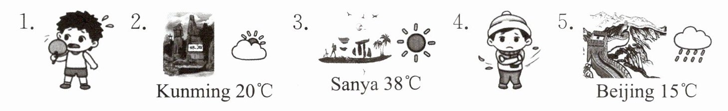 )5. What time is it? E. It's cool and rainy.