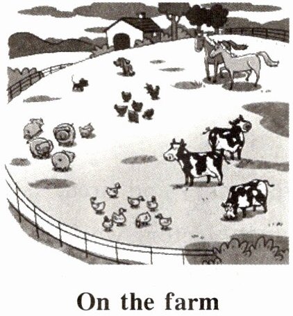 请根据图片内容并适当发挥,以“On the farm”为题写一篇短文,介绍农场上的动物。