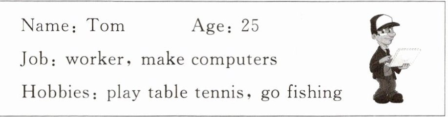 This is my uncle, Tom. He is 25 years old. He is a worker. He makes computers. He has many hobbies. He likes playing table tennis and going fishing. He often plays table tennis after work. And on weekends, he usually goes fishing. He is very busy but happy.