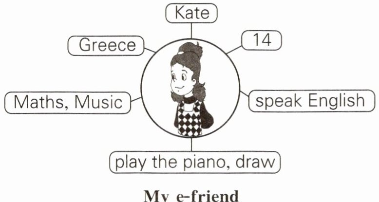 My e-friend is Kate. She is 14 years old and she lives in Greece. She can speak English very well. Her favourite subjects are Maths and Music. She likes playing the piano and drawing pictures. We often chat on the Internet. I like my e-friend very much.