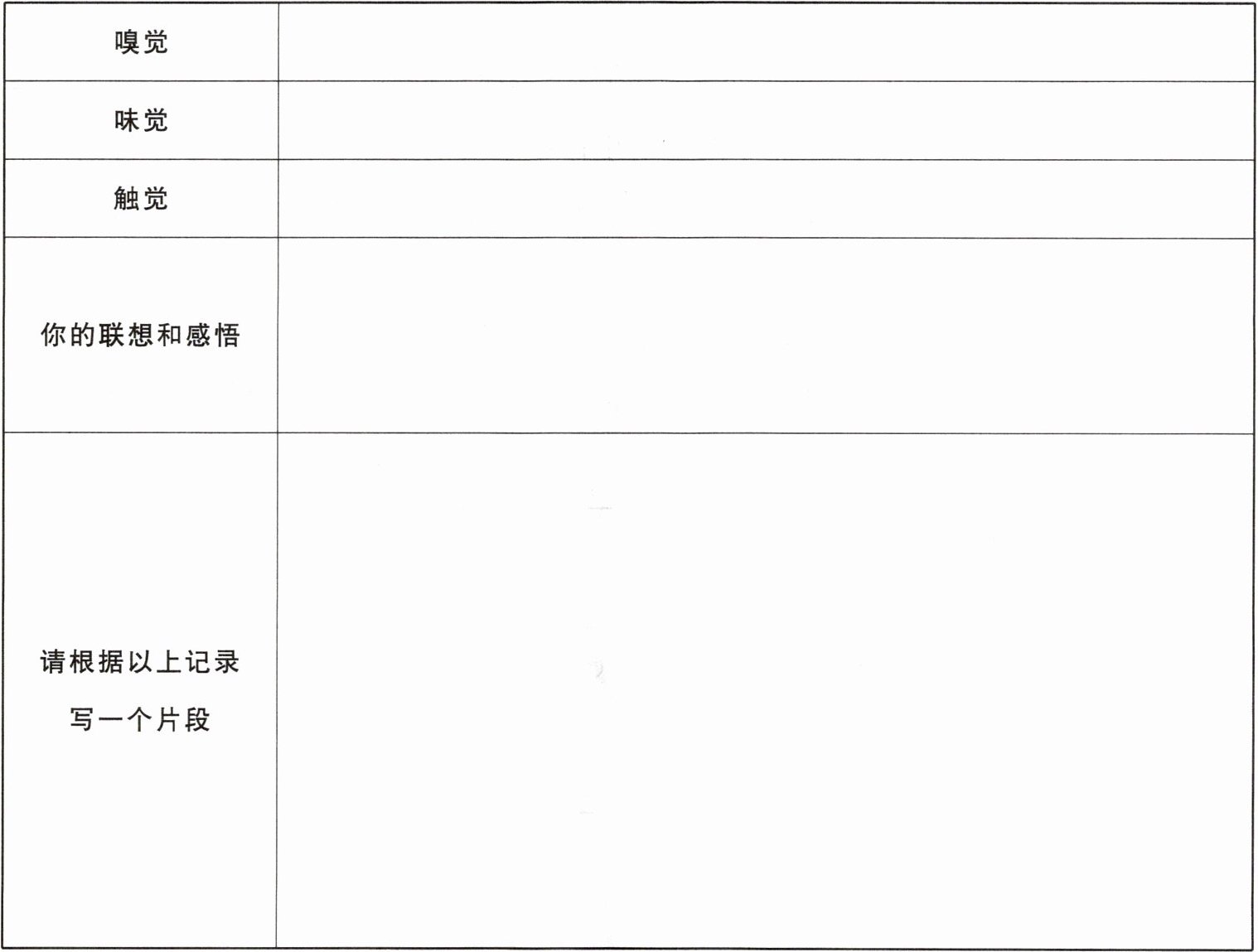 | 听觉 | 秋风穿过树林,叶子“沙沙”地唱着歌,偶尔有几只麻雀“叽叽喳喳”地飞过 |