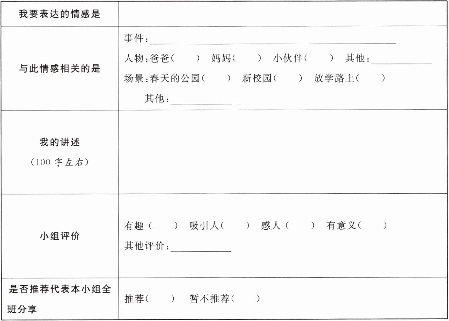 ) 小伙伴( ) 其他:______ || | 场景:春天的公园( ) 新校园( ) 放学路上( ) |
