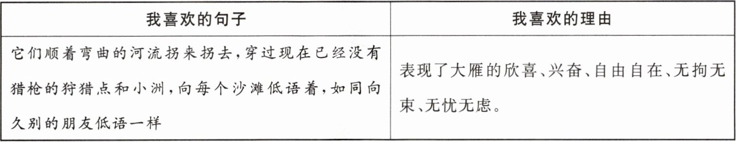 | 它们顺着弯曲的河流拐来拐去,穿过现在已经没有猎枪的狩猎点和小洲,向每个沙滩低语着,如同向久别的朋友低语一样 | 表现了大雁的欣喜、兴奋、自由自在、无拘无束、无忧无虑。 |
