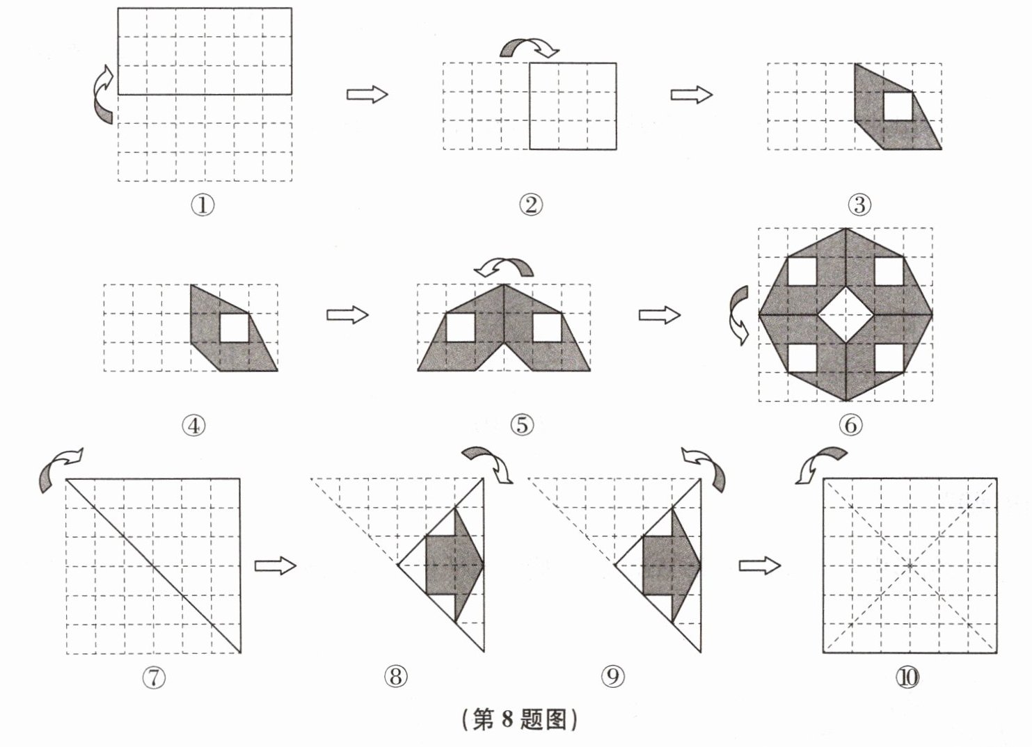 对于图⑦至图⑧中的另一种剪纸方式,请仿照图④至图⑥中逆向还原的方式,在图⑩的正方形网格中画出还原后的图案,并判断它与图⑥中最后得到的图案是否相同.