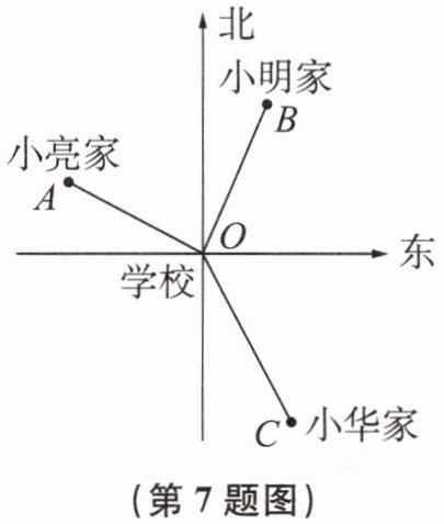 7. 如图,点A,B,C,O分别表示小亮家、小明家、小华家、学校的位置.点A位于点O的北偏西$65^{\circ}$,点B位于点O的北偏东$25^{\circ}$.
