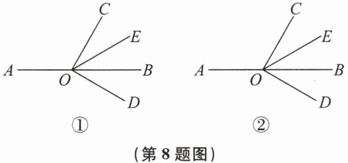 8. 已知O是直线AB上的一点,过点O作$∠COD$,且$∠COD= 90^{\circ}$,过点O作射线OE平分$∠BOC$,$∠AOC= 120^{\circ}$.