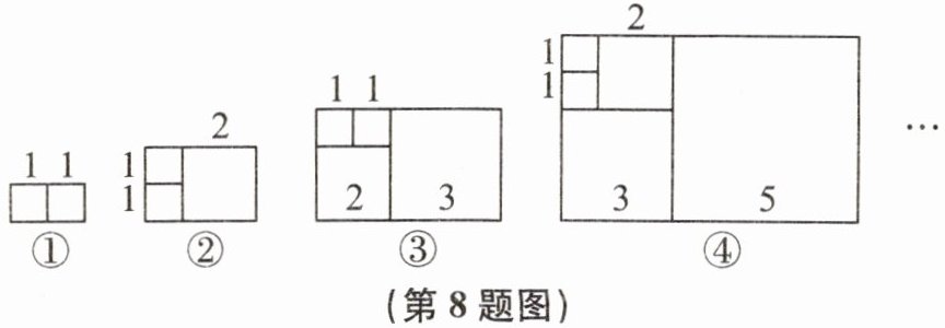 8. 意大利著名数学家斐波那契在研究兔子繁殖问题时,发现有这样一组数:1,1,2,3,5,8,…,其中从第三个数起,每一个数都等于它前面两个数的和.现以这组数中的各个数作为正方形的边长值构造正方形,再分别依次从左到右取2个、3个、4个、5个…正方形拼成如下长方形,若按此规律继续作长方形,则序号为⑦的长方形周长是 (
