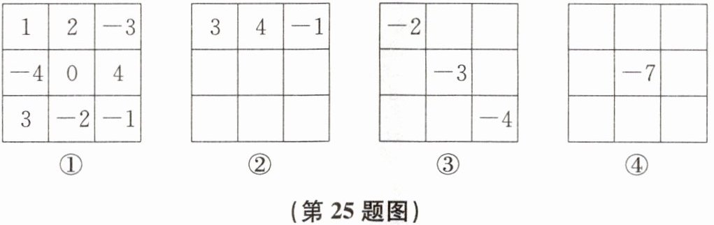 25. 如图①所示是一个方阵图,每行的3个数、每列的3个数、对角线的3个数相加的和均相等.如果将方阵图的每个数都加上同一个数,那么方阵图中每行的3个数、每列的3个数、斜对角的3个数相加的和仍然相等,这样就形成新的方阵图.请根据图②至图④中给出的数,对照原来的方阵图,完成图②至图④的方阵图.