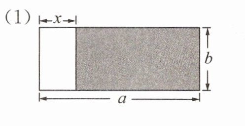 (1) 由图可知,整个大长方形的长为 $a$,宽为 $b$,空白小长方形的长为 $x$,宽为 $b$。阴影部分的面积等于大长方形的面积减去空白小长方形的面积,即 $ab - xb = b(a - x)$。