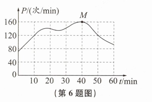 6. 某次运动中,小明的心率P(单位:次/min)与运动时间t(单位:min)之间的变化关系如图所示.请根据图像,回答下列问题.