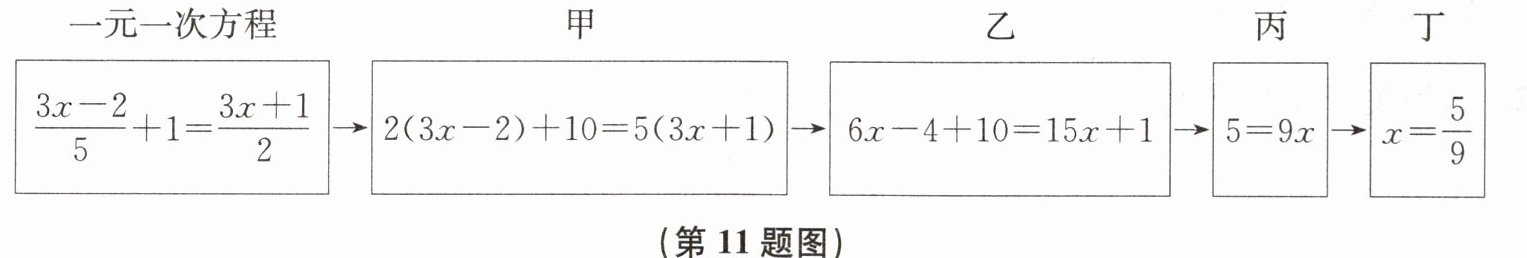 11. 学习完解一元一次方程后,同学们进行了解一元一次方程接龙,规则如下:每人只能看见前一人给的式子,并且进行计算,再将结果传递给下一人,最后求出方程的解.过程如图所示,则接力中自己负责的一步出现错误的是