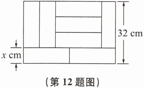 12. 如图,用8块完全相同的长方形地砖拼成了一个长方形图案(地砖间的缝隙忽略不计).设每块地砖的宽为$x\ cm$.根据题意,可列方程为
