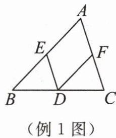 例 1 如图,在△ABC 中,D 是 BC 的中点,点 E,F 分别在边 AB,AC 上,且 DE // AC,DF // AB。求证:BE = DF,DE = CF.