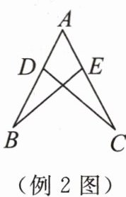 例 2 如图,点 D,E 分别在边 AB,AC 上,∠B = ∠C,AC = AB。求证:△ABE ≌ △ACD.