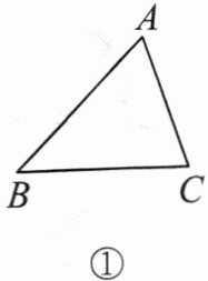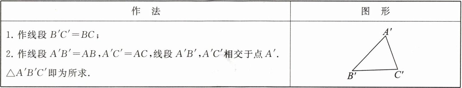 例 如图①,给定△ABC,在透明纸上用直尺和圆规作△A'B'C',使得A'B' = AB,B'C' = BC,A'C' = AC。这两个三角形全等吗?