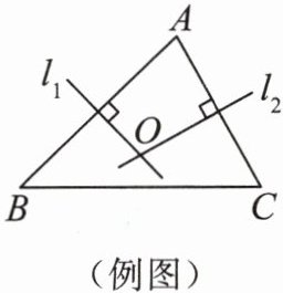 例 如图,在 $ \triangle ABC $ 中,$ AB $,$ AC $ 的垂直平分线 $ l_1 $,$ l_2 $ 相交于点 $ O $.求证:点 $ O $ 在 $ BC $ 的垂直平分线上.