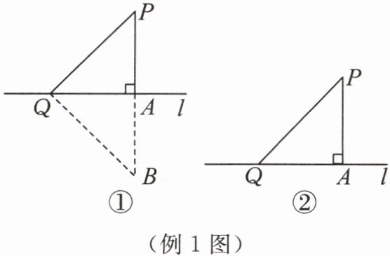 例1 如图①,点P在直线l外,PA⊥直线l,垂足为A,Q为直线l上不同于点A的任意一点.求证:PA<PQ.小明的操作如下:如图①,延长PA至点B,使得AB= PA,连接BQ……