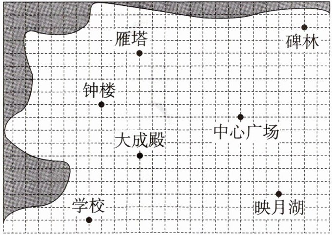 (1)请在图中建立平面直角坐标系,并写出碑林的坐标。