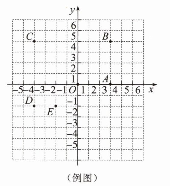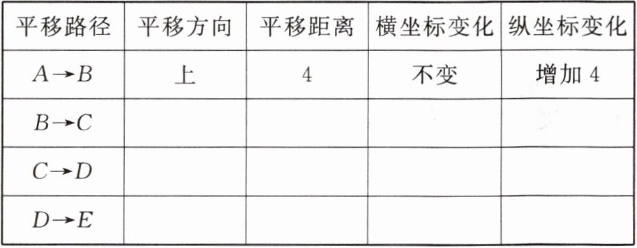 例 如图,一只甲虫在平面直角坐标系中沿着网格线运动.它从点 $ A $ 出发,依次爬到点 $ B $,$ C $,$ D $,$ E $ 处.如果把甲虫看作一个点,根据甲虫的平移过程,填写下表.