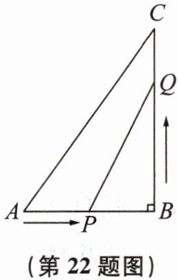 22. 如图,在$\triangle ABC$中,$\angle B= 90^{\circ}$,$AB= 5$cm,$BC= 8$cm. 点P从点A开始沿边AB向点B以1 cm/s的速度移动,同时点Q从点B开始沿边BC向点C以2 cm/s的速度移动,当其中一点到达终点时,另外一点也随之停止运动.