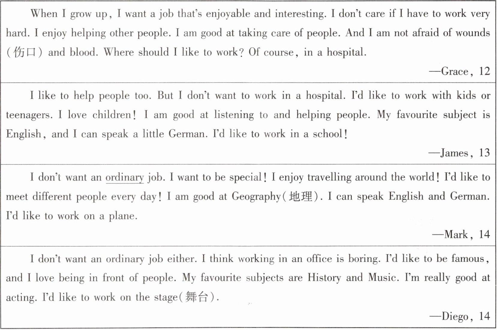 | I don't want an ordinary job either. I think working in an office is boring. I'd like to be famous, and I love being in front of people. My favourite subjects are History and Music. I'm really good at acting. I'd like to work on the stage (舞台). | —Diego, 14 |