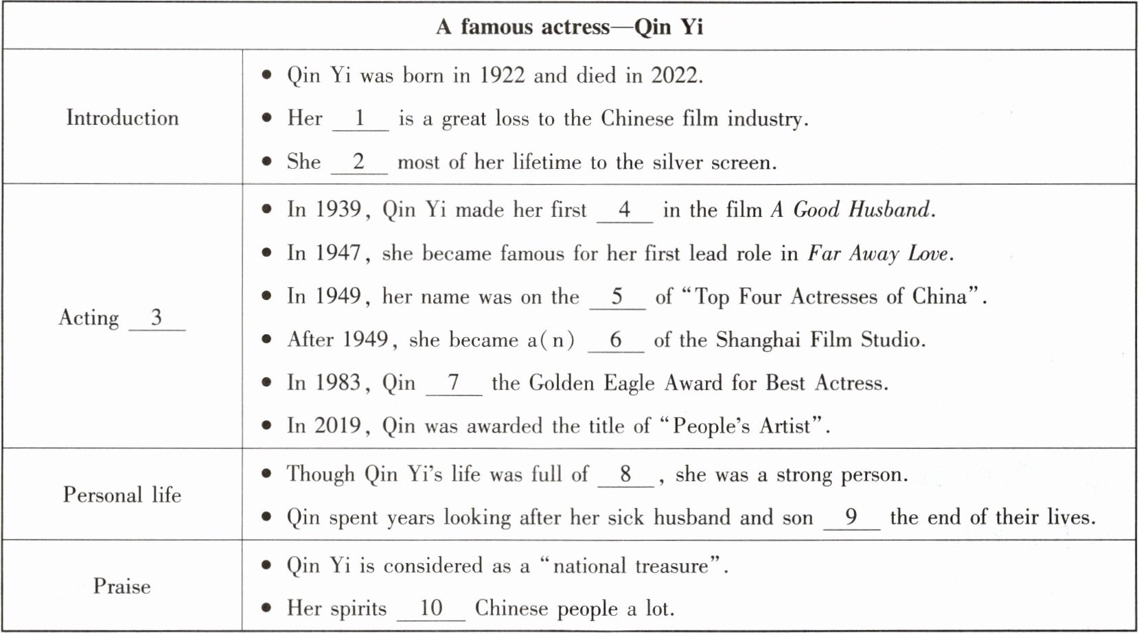 | Introduction | • Qin Yi was born in 1922 and died in 2022.• Her 1 is a great loss to the Chinese film industry.• She 2 most of her lifetime to the silver screen. |
