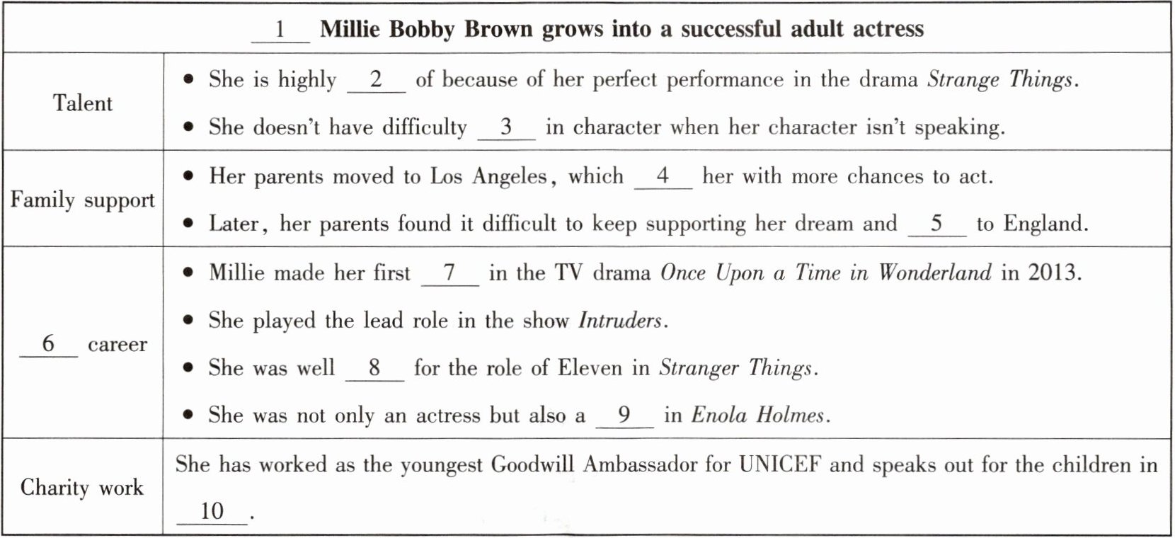 | Family support | • Her parents moved to Los Angeles, which 4 her with more chances to act. • Later, her parents found it difficult to keep supporting her dream and 5 to England. |