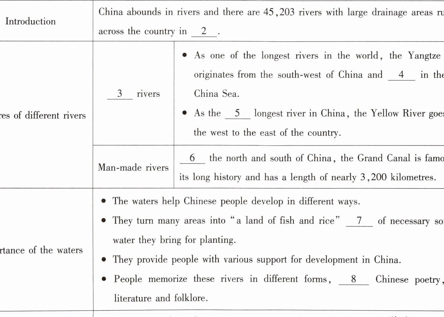 | Features of different rivers | 3 rivers | • As one of the longest rivers in the world, the Yangtze River originates from the south-west of China and 4 in the East China Sea. |