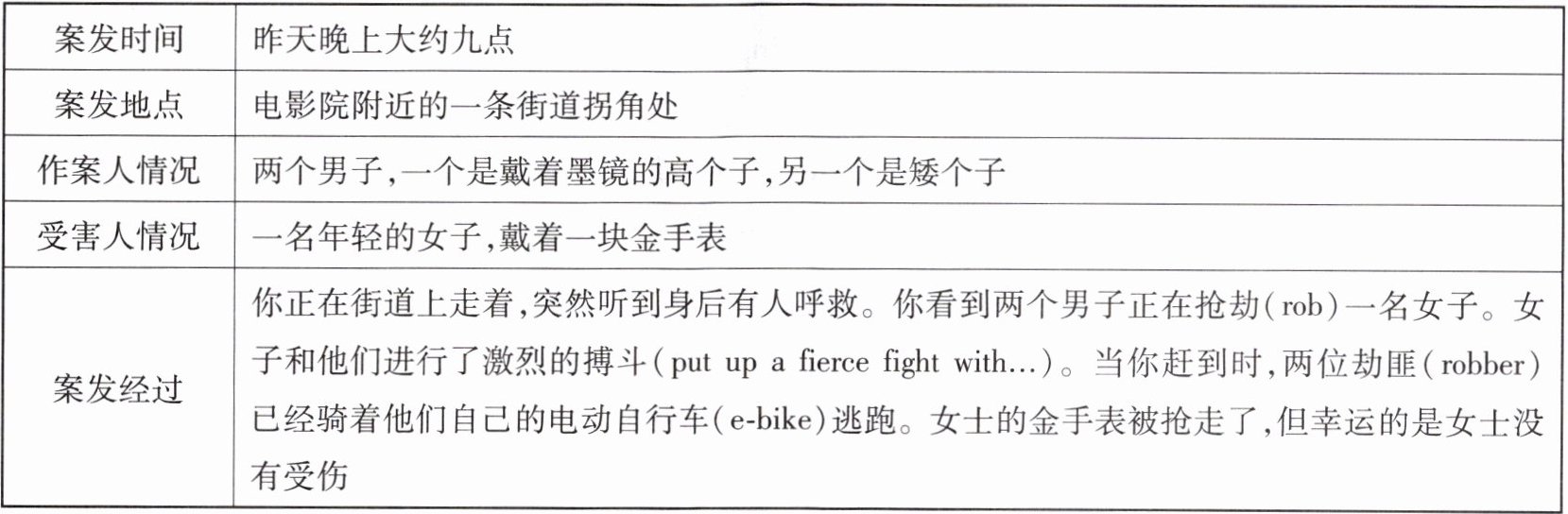 |案发经过|你正在街道上走着,突然听到身后有人呼救。你看到两个男子正在抢劫(rob)一名女子。女子和他们进行了激烈的搏斗(put up a fierce fight with...)。当你赶到时,两位劫匪(robber)已经骑着他们自己的电动自行车(e-bike)逃跑。女士的金手表被抢走了,但幸运的是女士没有受伤|