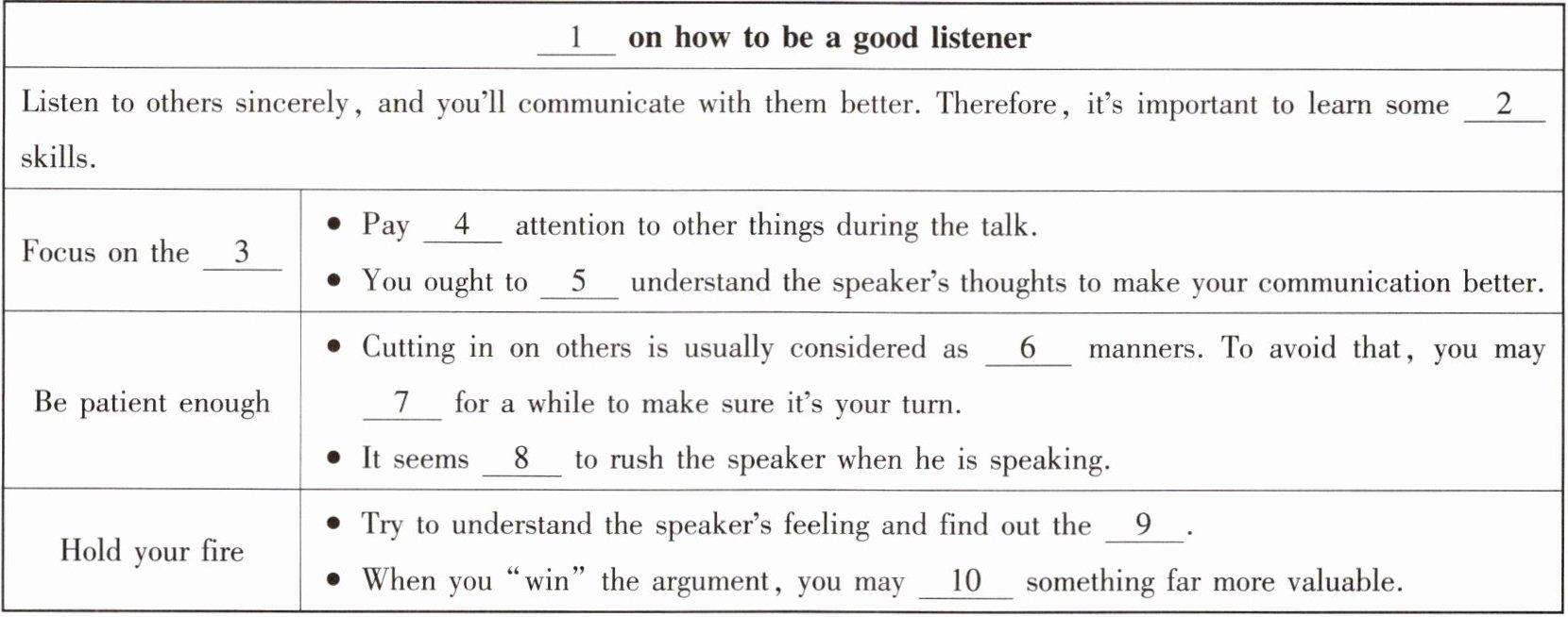 | Focus on the 3 | • Pay 4 attention to other things during the talk.• You ought to 5 understand the speaker's thoughts to make your communication better. |