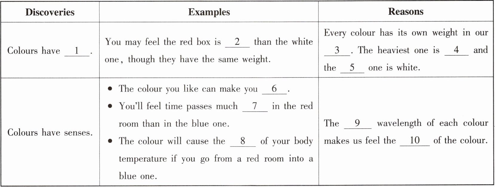| Colours have senses. | • The colour you like can make you 6 .• You'll feel time passes much 7 in the red room than in the blue one.• The colour will cause the 8 of your body temperature if you go from a red room into a blue one. | The 9 wavelength of each colour makes us feel the 10 of the colour. |