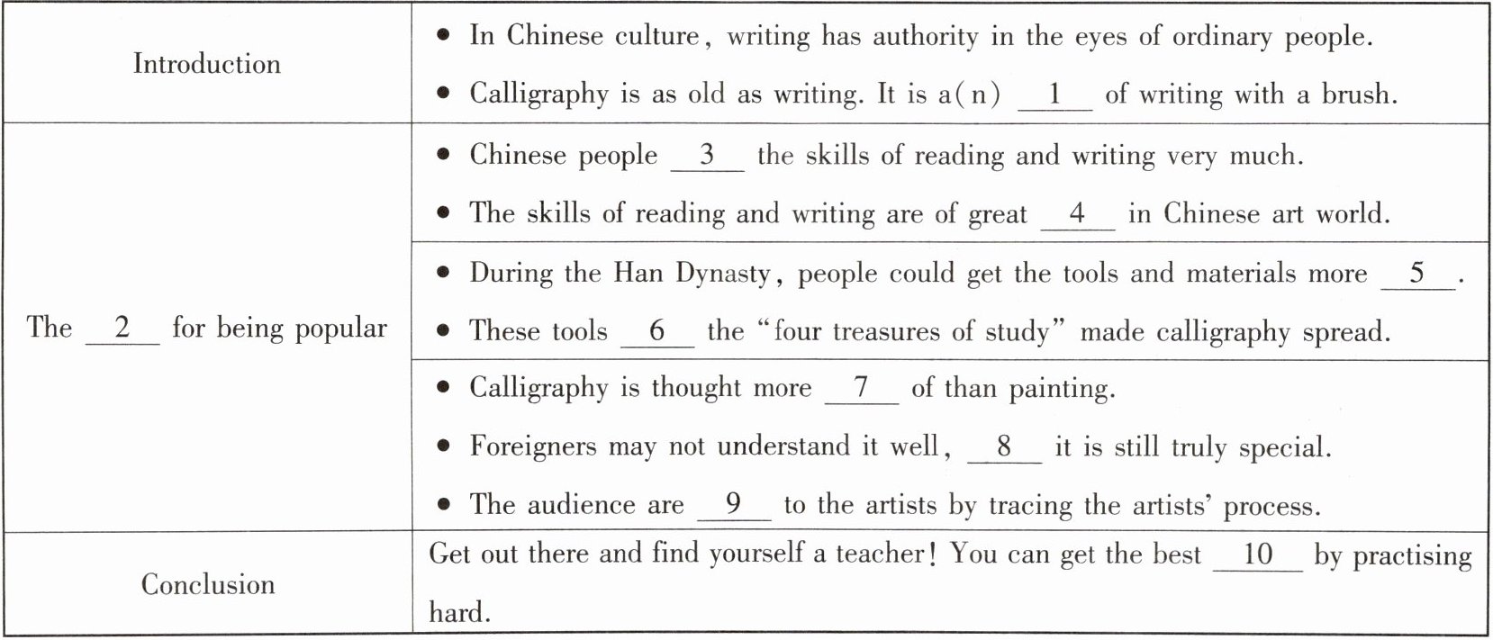 | The 2 for being popular | ● Chinese people 3 the skills of reading and writing very much. ● The skills of reading and writing are of great 4 in Chinese art world. ● During the Han Dynasty, people could get the tools and materials more 5. ● These tools 6 the "four treasures of study" made calligraphy spread. ● Calligraphy is thought more 7 of than painting. ● Foreigners may not understand it well, 8 it is still truly special. ● The audience are 9 to the artists by tracing the artists' process. |