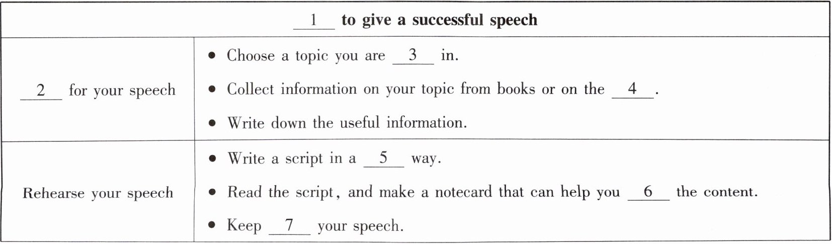 | Rehearse your speech | ● Write a script in a 5 way.● Read the script, and make a notecard that can help you 6 the content.● Keep 7 your speech. |