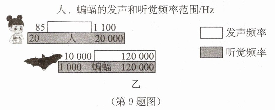 9. 如图甲所示为导盲杖及其说明书,导盲杖发出的声音遇到障碍物后反射回来,手柄接收回声后通过振动提醒盲人前方有障碍物.人、蝙蝠的发声和听觉频率范围如图乙所示.($15^{\circ}C时空气中的声速为340\ m/s$)