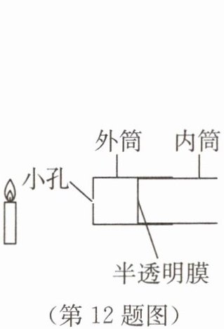 12. 如图所示,小明用针孔照相机(即小孔成像实验装置)观察蜡烛的烛焰,若保持小孔和蜡烛的烛焰位置不变,则下列分析正确的是(