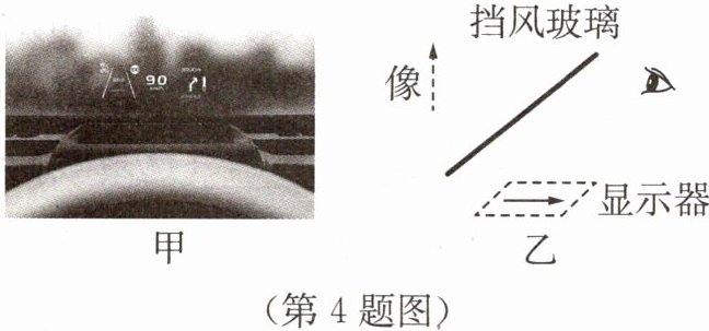 4. 为了避免驾驶员在汽车行驶时低头看仪表造成事故,人们发明了如图甲所示的汽车平视显示系统.如图乙所示是其工作原理图,将水平显示器上的行车数据通过前挡风玻璃呈现在正前方,驾驶员透过挡风玻璃(看作平面镜)往前方观看的时候,能够将车外的景象与竖直呈现的行车数据融合在一起.下列说法正确的是(