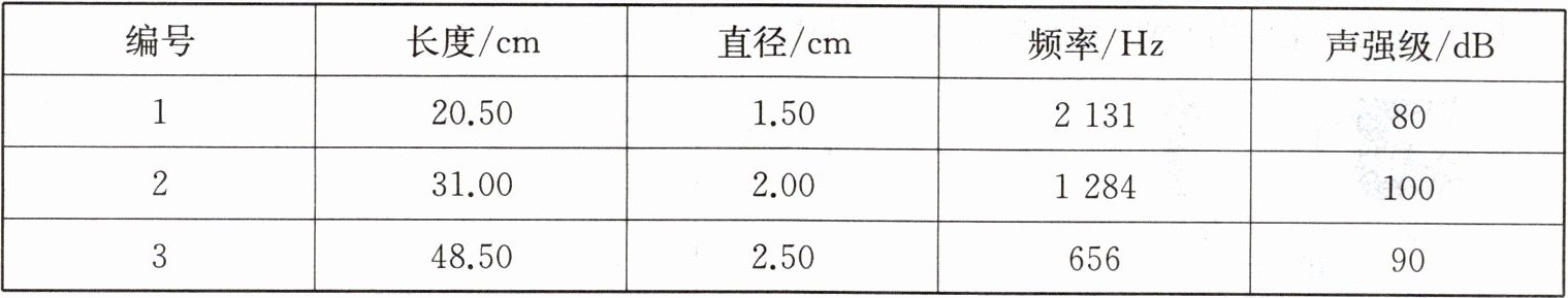 |编号|长度/cm|直径/cm|频率/Hz|声强级/dB|