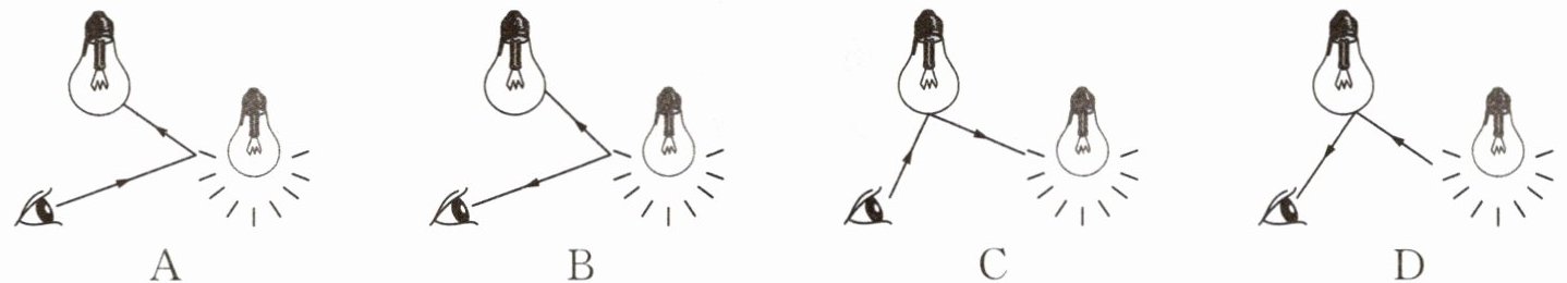 2. 黑暗的房间里有两个灯泡,只有一个灯泡点亮,但人能看到未点亮的灯泡.下列对于“看到未点亮的灯泡”所画的光路图,正确的是(
