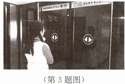 3. 如图所示,某市民正站在平面玻璃制的地铁安全门外候车.地铁到站后,安全门向两侧打开.下列对该市民在左、右两侧安全门中像的情况分析正确的是(