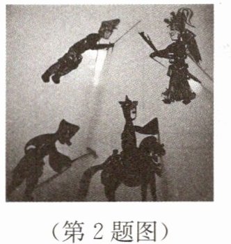 2. 如图所示是国家级非物质文化遗产“皮影戏”.它是用灯光将受皮影的操纵者操作的人物或物件表演的影投射到屏幕上.下列古诗句蕴含的光现象与“皮影”的形成原理相同的是(