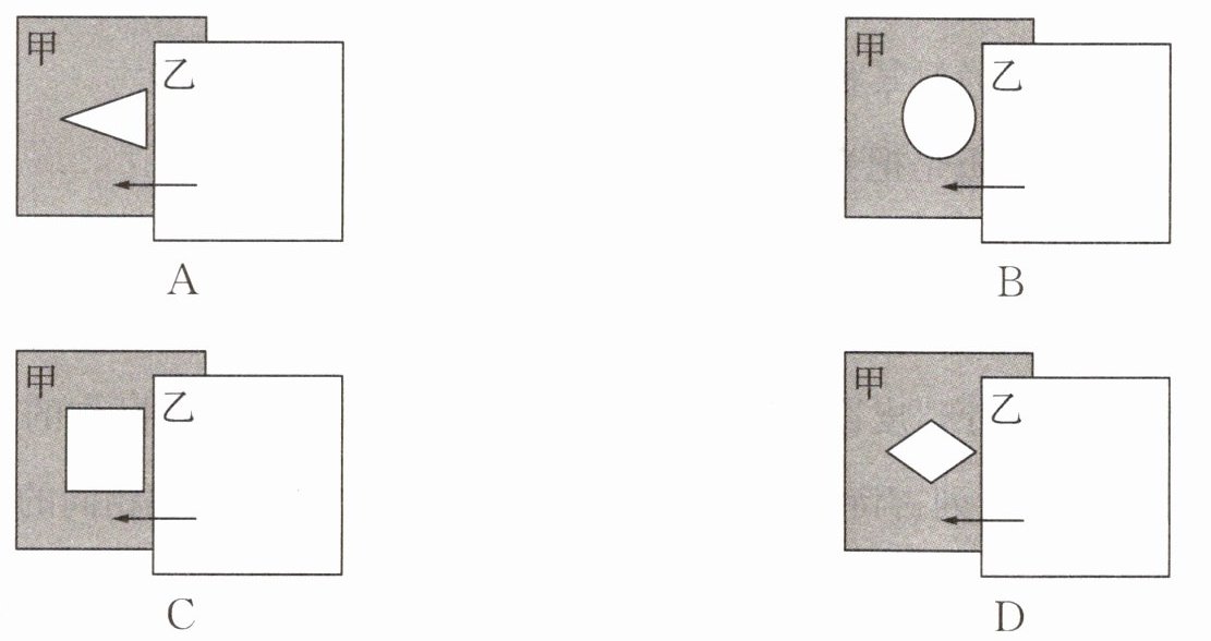 5. 在探究树荫下光斑的综合实践活动中,为了研究孔的大小对光斑形状的影响,小明设计了四种有不同形状孔的卡片甲,并用另一张卡片乙覆盖在甲上,如图所示.接着,从图示位置沿箭头方向水平移动乙,观察光斑形状的变化情况.下列合乎要求的是(