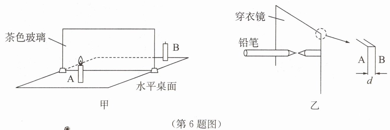 6. 小明在做探究平面镜成像特点的实验时,所用器材有茶色玻璃板、光屏、刻度尺、两支完全相同的蜡烛 $ A $ 和 $ B $.