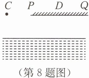 8. 小明根据所学的平面镜知识,设计了如图所示的水位测量仪,从 $ C $ 点发出一束与水平面成 $ 45^{\circ} $ 角且方向不变的激光,经水面反射后,在光屏上的 $ D $ 点形成一个光斑,光斑位置随水位变化而发生变化.若 $ C $ 点与水面相距 $ 3m $,则 $ C $ 与它在水中的像 $ C' $ 之间的距离为