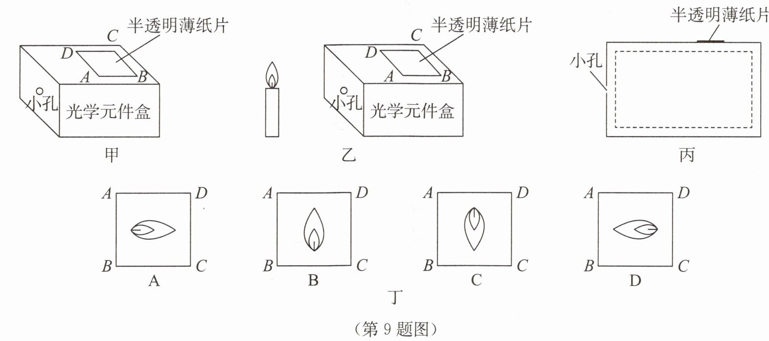 9. 科技活动月中,科创小组制作了一个长方体光学元件盒,如图甲所示,在盒子左侧开有一小孔;上表面右侧开有一正方形窗口,窗口上贴有一半透明薄纸片 $ ABCD $,其余部分处于密封状态.小明将一根点燃的蜡烛立在小孔正前方,如图乙所示,蜡烛的光经过小孔后全部被盒中的一块平面镜反射(图中未画出),在半透明薄纸片上形成烛焰的像.