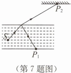 7. 如图所示,泳池水面下方的光源 $S$ 发出的一束光经水面反射后在池底产生光斑 $P_1$,折射光线在天花板上产生光斑 $P_2$.若水面下降一小段距离,则(