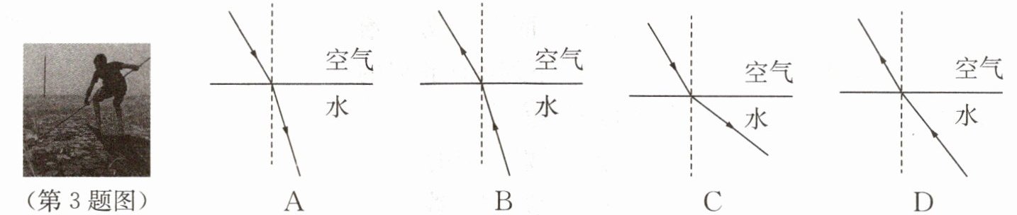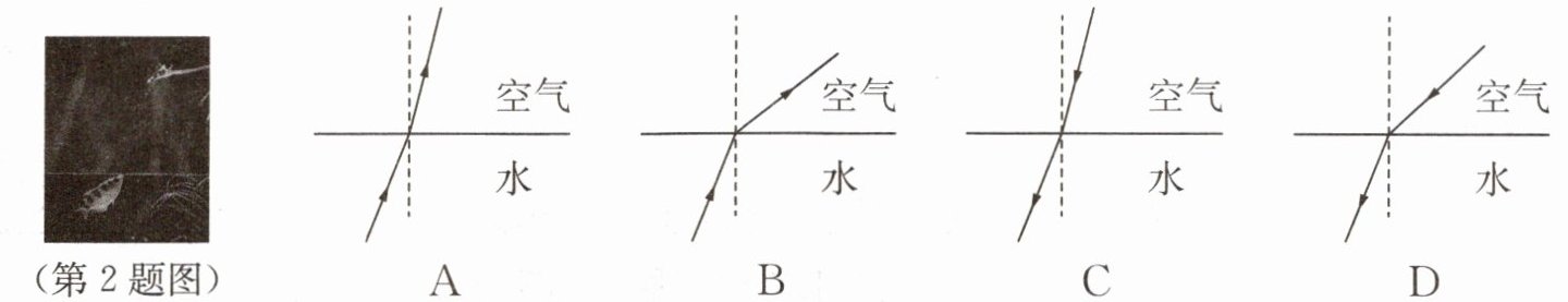 2. 如图所示,射水鱼发现水面上的小昆虫后,能从口中快速喷出一束水柱,将昆虫击落水中,实现捕食.下列光路图能表示射水鱼观察水面上小昆虫的是(